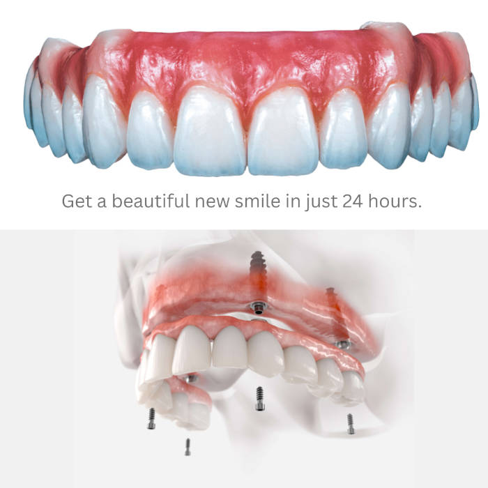 All-On-X™ Treatment - aka Teeth In A Day Procedure - Replace a whole row of missing teeth with fixed PMMA, acrylic, or zirconia arch. Zirconia is a highly durable material that can last 20+ years.